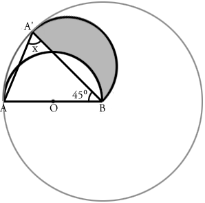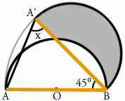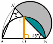 1.まずは小手調べの問題ですね。 オレンジ色で書いた線が同じ長さだってことに 気づきましたか? 辺AB と 辺A'B はもともと半円の同じ部分ですから、 両方とも 16cm です。 この二等辺三角形をよく見ると、 角BAA' と 角BA'A は同じ大きさです。 三角形の3つの角の大きさを合計すると 180°なので 角X の大きさは (180-45)÷2 = 67.5 °となります。 ![]() 2.灰色の線の部分は、点B を中心とする 半径16cm の円の一部です。 直径 X 3.14 が円周の長さですから、 大きな円の円周の長さは 16 X 2 X 3.14 = 100.48cm 灰色の線の部分は円が 360°あるうちの 45°ぶんなので 100.48 X 45/360 = 12.56cm となります。 ![]() この問題、横着をして16cmを2倍せずに6.28cm なんていう 答えを出した人が結構いるんじゃないかと思うんですが、 どうですか? できましたか? 3.灰色の部分は 辺A'B を直径とする半円から青い部分を 引いた残りの部分です。ここまではわかりますよね。 この青い部分の面積が求められるかどうかが 解けるかどうかの分かれ目です。 下にオレンジ色で書いた補助線、書けましたか? ![]() こうやって補助線を引けば、 青い部分が、円の一部から三角形OCB を引いた残りだという ことがわかります。 パイ型の部分(円の一部)の面積は 8 X 8 X 3.14 X 90/360 = 50.24cm2 三角形OCBの面積は 8 X 8 X 1/2 = 32cm2 なので、青い部分の面積は 50.24 - 32 = 18.24cm2 となります。 A'Bを直径とする半円の面積は 8 X 8 X 3.14 X 180/360 = 100.48cm2 ですから、求める面積は 100.48-18.24 = 82.24cm2となります。 3番までできた方おめでとうございます。 今回は途中で面倒になって答えを見ちゃった人が 結構いるかもしれませんね。 次回はもっと計算が楽な問題を選んでみます。 |