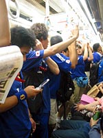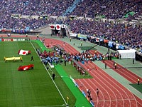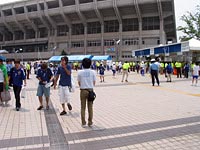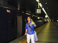 こんちは。 ROCK西本でやんす。 日本グループリーグ突破をかけた 日本VSチュニジア戦に行ってまいりましたっ! 興奮さめやらぬ大阪から勢いだけの 原稿をお送りいたしまっす。 ![]() ついたよー。 朝7時45分羽田発の飛行機で関空に入るはすであったのが パソコンのACアダプターを忘れてしまい 家に取りに帰っていいるうちに 飛行機に乗り遅れるというハプニングがありながらも 無事、関空に到着! 15分後の便の空席待ちに滑りこんだのでありました。 ここで今回の旅に同行する奥田さんと合流。 ![]() サッカー友奥田さん 奥田さんとROCK西本とはサッカー観戦仲間であります。 奥田さんは7時45分の飛行機で一足先に到着。 ![]() 電車界の「鉄人28号」と呼ばれる 南海電車ラピートにのって宿泊ホテルのある 難波へ移動。 ここで生茶を購入すると キオスクのおばちゃんから 「わたしらの分も応援してね、応援がんばってね」 と声をかけられる。 今日の試合はキオスクのおばちゃんにとっても 他人事ではないらしい。 ![]() 宿泊先のある難波に到着。 パソコンの調子が悪いので デスクを借りるために 前職ってこともあって 知りあいの多い吉本興業に立ち寄る。 さすがにユニフォームを着たまま 会社に入るのは気恥ずかしい。 ![]() 吉本界隈では有名な 「ちとせ」というお店です。 ここでちょっと早めの昼食。 大阪ならではというか 肉うどんとご飯というメニューを食べる。 ここでもうどん屋のお客さんに 「応援頑張って!」と声をかけられる。 青い日本代表のユニフォームを着ている人は 今日に限ってはなんだか特別みたい。 ちょっと責任を感じながら 「大阪の丸の内線」こと地下鉄御堂筋線にのって スタジアムへ向かう。 ![]() 地下鉄の中は青いユニフオームが一杯。 「なんだか盛り上がりすぎて 浮ついてきますねえ」と奥田さん。 うわつきついでに 途中下車してバッティングセンターへ向かう。 ![]() さすがにお昼のバッティングセンターには 日本代表のユニフォームを着ている人は一人もいなかったが 松阪の130キロの速球を 奥田さんと3ゲームづつやってみたりした。 ![]() 客はワシと奥田さんだけであった。 よりみちをしながらも ようやく会場である長居に到着。 フェイスペイント屋さんが大人気であった。 ![]() スタジアム付近は交通規制が徹底しており 普段のサッカーの試合とはまったく違った 雰囲気がする。 なんだか「戦い」の空気なのだ。 うきうきわくわくというより 「やるぞっ!」て感じなのだ。 ![]() 入場時にチケットと身分証明書との照合チェック等があると 事前にアナウンスされていたが どうやらそういうこともなく すんなりと入場できた。 ![]() キックオフの3時間前にスタジアムに入場する。 開門したばかりで場内は閑散としているようですが 実は日差しがきついので屋内にみんな退避してたりします。 ![]() チケットを見ながら自分の席を探す。 ゴール裏のいわゆる日本代表サポーターが集まる 「熱い席」であることは確かだ。 席は一番後ろから5列目。 それでもスタジアムの設計のおかげなんだろうが ピッチとの距離はそんなに感じない。 ![]() キックオフ1時間前。 日本代表チームのユニフォームをかたどった フラッグが広げられる。 もりあがるスタンド。 あちらこちらで「日本コール」が始まりだす。 ![]() そうこうしていると 日本代表イレブンのウォーミングアップが開始される。 ボルテージがあがりっぱなしのスタンド。 延々続くニッポンコール。 実はこの時点ですでに手が痛い。 ![]() キックオフ30分前。 先発メンバーを発表! 中田英寿選手がコールされた時 悲鳴のような歓声がスタジアムに響く! 頼むぜヒデ! テレビでおなじみの 今回のワールドカップのテーマが流れてきて 選手が入場。 この時、明るいビルで観戦中の あややより電話が入る。 電話口でもニッポンコールを続けるワシ。 ![]() 膠着したゲーム運びであった前半。 観客もちょっと堅かったが 大阪の観客はずっ〜っとあの男の登場を待っていた。 この長居スタジアムをホームとする セレッソ大阪の森島だ。 後半開始と同時に森島が登場すると 場内は一気にヒートアップ! ![]() 森島、中田のゴールが決まり 大騒ぎのスタジアム。 アイーダの合唱が延々と続き ロスタイム表示が1分と表示されると 勝利を確信して抱きあう人々も・・・。 ![]() 試合終了の瞬間っす! もりあがり過ぎてなんだかぼーっとしたまま 地下鉄に乗り込んだ。 当然地下鉄は日本代表でいっぱい。 ![]() ホテルのある難波に戻ると 阪神優勝より凄いんじゃないかという盛り上がり。 ![]() ホテルの中にもこんな人がいた。 ![]() ということで気を落ち着けて原稿を書きだしたんだけど どうやら道頓堀がえらい騒ぎになっているらしい。 道頓堀に飛び混む人が後を絶たないらしい。 ![]() こうなったら原稿なんて書いていられないよ。 ぼくも夜の街に繰り出してきま〜っす! 次はトルコ戦だっ! ありがとうニッポン! 頑張れニッポン!