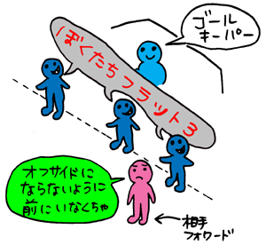 日本代表、今回のワールドカップで 思っていた以上の活躍を見せてくれましたね。 日本の選手といえば、大会前は 「ナカタ」「ゴン」しか知らなかったわたくしですが、 森島、柳沢、稲本など、いろんな選手の名前を覚えました。 そして、それぞれの選手がそれぞれの役割を きちんと果たして、みごとなプレーを見せてくれました。 日本のプレースタイルに学ぶこと、けっこう多かったぁ、 と思っています。 さて、先日このページで フラット3ってなぁに? と、呼びかけましたところ、 みなさまよりたくさんのメールをいただきました。 ありがとうございました! ふむふむ、フラット3を語りたい人は 日本中にたくさんいらっしゃったようだ! そのうちの、いくつかをご紹介させていただきます。 フラット3(ふらっと・すりー、と読みます)は、つまり、 ディフェンスの方法のことです。 サッカーの守りには、大きくわけて、 スリーバック(3人のディフェンス)と フォーバック(4人のディフェンス)があります。 日本は3人で、スリーバックです。 (こう書くと、フォーバックの方が人数が多そうですが、 実は逆なんです。 フォーバックのうちのふたりはそれぞれの端を守ります。 だから、中央を守るのはふたり。 スリーバックの場合も端を守る人はいますが、 何故かその人はミッドフィルダーに 数えられるようです。) そして、スリーバックの場合は、 ふつうはふたりがやや前にいて 相手のフォワード(いちばん前の選手で、普通はふたり)を マークし、あとひとりがその後ろに 「保険として」残っているのが普通です。 しかし、トルシエジャパンの場合は、 3人が横一線 (フラット・平面上)に並ぶ システムなのです。 フラットなスリーバックだから 「フラットスリー」なんですね。 (たまたまさん) なるほどなるほど。 フラット3は、3人でディフェンスをする 守りのシステムなんですね。 で、トルシエさんの「フラット3」は 横一列に並んでることが特徴なわけだ。 フラット3は、ディフェンダー(防御)3人が 横一列に並んで、ディフェンスのラインをコントロールし、 相手のオフサイドを誘うシステムです。 マンツーマンでは封じきれない世界の強豪に対抗するため、 トルシエ監督が導入した日本代表の戦術の柱なのです。 (Nさん) 相手のオフサイドを誘えるから、 フラットにしているのだ、と。 フラット3! トルシエさんが大好きなふらっと3! 通常は4バックなど、ゴールキーパーの前に 「スイーパー」と呼ばれる人が守りますが フラット3はそれがありません。 このフラット3は相手にオフサイドトラップを かけやすいんです。 日本代表の試合でも3人が手を上げて キーパーとは反対のほうに走っているようすを よく見ませんでしたか? あれはオフサイドトラップをかけようとしてるんです。 (くりこさん) ![]() ディフェンダーが3人、ゴール前を防御する。 ![]() 3人が全員、ゴールよりわざと離れて、 パスをもらいそうな敵の選手を置き去りにして オフサイドにする。 これを「オフサイド・トラップ」という (たまたまさん) ただしこのフラット3、 サイドを崩されたり、ドリブルで突破されると、 カバーが薄くなるのが弱点。 ワールドカップ本大会前の試合では、海外の選手に その弱点をまんまと突かれることが多々見られました。 (おもしろ兄弟 兄さん) そうか、ゴールキーパーの前には、 3人しかいないんですものね。 フラット3にはディフェンダーひとりひとりの 守備力の高さが要求されます。 そのなかでも真ん中(センターバック)の人は ほかの比ではありません。 オフサイドトラップをかけるために 3人に統率が必要なのです。 フラットスリーの申し子森岡選手、 そして、宮本選手・・・。 すごいんですよ・・・。 (くりこさん) フラットスリーというのは、 ひとりが余る「スリーバック」の利点と、 オフサイドを取りやすい 「フォーバック」の利点を併せ持つ 新しい守りのシステム、というわけです。 でも、使いこなすのが難しく、 もちろん弱点もあるので そこをつかれたときの対応をどうするか、 という問題もあります。 ロシア戦では、日本はこの難しい課題をみごとにこなして 0点に抑えましたね! 森岡選手の怪我で急遽出番が回ってきて、 このシステムを中心でコントロールした宮本選手は、 ヨーロッパのメディアでは高く評価されたそうですよ。 (たまたまさん) ディフェンダー3人がトラップになるフラット3。 これに象徴されるように、今回のトルシエ采配には 注目すべき点がたくさんあったのですね〜!!