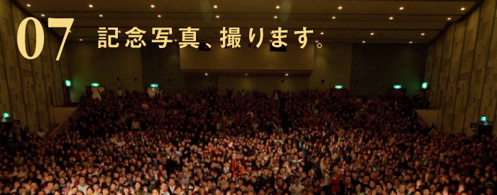 この場所、この時間ならではの 空気といっしょに 「稽古場」がおわってすぐ みんなで記念写真を撮りたいと思います。 (記念写真は、「ほぼ日」のイベント恒例と なってまいりましたね) 遠くからご来場いただいたみなさんも、 地元のみなさんも、 もちろん矢野さんも糸井も、 いっしょに笑顔で写真におさまりましょう!