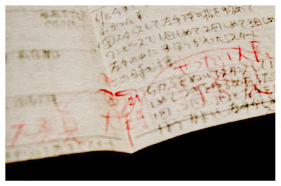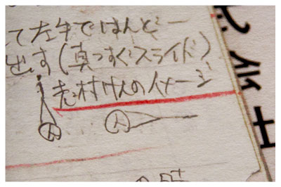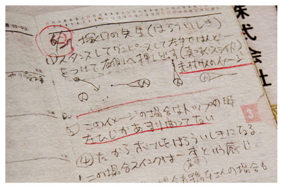 | ほぼ日 | めちゃくちゃ大事だったんですね。 ‥‥えーっと、 朱書き部分に何と書いてあるかというと、 「ちからをぬいてスタンスして1回しめて つぎをゆるめたらだめ 1回、2回、3回と左手をしめるほうがよい 左手がしめきってからスタンス」 |