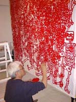 | 第8回 はじめてのひと、特にどーぞ。 この骸骨のコーナー、 はじめて見るひともいるかな。 今回はそんなひとにうってつけ。 今までは田中靖夫さんの つくったものからいろいろきいてたけど、 ちょっと今まで何していらしたのかもきいたのだ。 今日から数回インタビューが続きます。 骸骨ばっかり描いたり、ゴキブリつくったり、 このおっさん、何なんだ!と思ってるひと、 あなたはとても正しいぞ。 こないだの日曜日は、こんな現場(↓)。 あ、でも、他の仕事もしてたりして、 例えば本の装丁では天使なんて描いたりもする。 でも量多いな、これ。どうしてそうなのか? インタビューがそれを解き明かすわけじゃないけど、 とりあえず、どーぞ。 ----そもそも、もともと画家志望でしたか。 もともとは心情的には、親父が建築家だったから、 できることなら建築家になりたかったんですよ。 でも物理とか数学もできなくちゃいけないでしょ? とても無理だから、とあきらめて、 インテリアデザインを目指しました。 ただ、やってみてインテリアデザインは ちょっと軟派な感じがしちゃったんで、 それで写真の専攻に移りました。 で、一年留年しちゃって、それから就職するのですが。 昔の、ぼくのときの昭和40年頃の就職っていうのは だいたい一度就職すると勤めあげるというか、 だから自分にあった就職をするというよりは 出会いがしらで一生つとめあげるという時代でした。 1番最初に入った会社でずっと定年までいるんだと ぼくなんかも、疑わなかったですよね、その当時は。 転職っていうのは人間としてつとめあがんなかった、 というようなもんだったから。 それで、何かずるずるずるーとつとめていました。 自動車会社に就職するときは 工場なんかの写真を撮れるという、 インダストリアルフォトでいけるかな、というのが なんかちょっとあったんだよね、機械が火花吹いてる、 ああいうのを写すチャンスがあるんじゃないか、と。 でも、配属されたらいきなりデザイン課で。 絵を描く訓練とか模型をつくる訓練とかを受けて、 結局15、6年経ったら、 「一生に一度の人生なんだから じぶんの好きな仕事をやっていいんだ」 という年になってやめたっていうか。 粘土で模型をつくったり いろいろな材料で模型つくるのをずっとやってる職場で そういうのはもともと子供の頃から好きだったから、 デザインの仕事そのものは好きでした。 ----デザインはどういうものをやっていましたか。 車の外形と内装のデザインです。 トヨタの子会社だったから、100%全部トヨタの仕事。 細かいコンセプトやエンジンのおきかたとか いわゆるデザインのおおもとっていうのは、 製品企画室というところでほとんどぜんぶ すごく細かく決められていて、 こちらでやるものというのはだいたい セリカにコロナのドアをくっつけて 新しい車をつくるとか、そういう仕事が多かった。 もう80%くらいがそういう仕事だったんじゃないかな。 それで審査というかコンペがあるんだけど、 そうするとだいたいお金との兼ね合いもあるじゃない? お金はあんまりかからないんだけど、 あんまり変わりばえしない、というのがひとつあって お金はすごいかかるけどすごい変わり映えするものも、 お金はそこそこかかってちょっと変わりばえするのも、 それぞれあるんだけど、審査されると、だいたい そのまんなかあたりの 「お金はそこそこ、変わりばえもちょっと」 というのになるんですよね。 そのうち慣れてコンペの結果が読めてきちゃうんです。 ただ、もう両極のまんなかの案が通るっていうのが わかっていても両方の案を出さなければいけないとか、 そういう無駄な仕事がものすごく多かったですね。 そういうことって多いよ、会社って。 それでやんなっちゃうっていうか。 さっきの天使は、橋本治さんの本の装丁だよ 会社のときって仕事がない時間ってすごくあった。 終わって時間をつぶすというか、 いかに仕事をつくるかっていうような。 役所につとめているひととか 普通の会社につとめているひともそうだけど、 全員が全員、自分が向いている仕事をやっているとか その仕事がどうしても必要っていうのとかではなくて、 たまたまそこにいるひとって多かったですよね。 一応会社にはつとめているんだけど、 八割くらいはたぶんそういう感じなんじゃないかなあ。 自分の仕事は他にあるんじゃないかな、 と思いつつ今の仕事しているひと、多いよ。 少なくとも会社にいた頃のぼくも、 自分で仕事を作り出すことはできなかったから、 この仕事が終わっちゃうと仕事がないときもあった。 そうすると手元にある仕事を時間かけてやったり。 正直に言って、きちっと残業で働いたら 時間で給料がもらえたわけじゃない? 残業しないとお金もらえないから、 楽に仕事をやるということじゃなくても、 今ある仕事をできるだけ丁寧にやる、 ということは現実にありましたね。 ----会社をやめたのは仕事が嫌