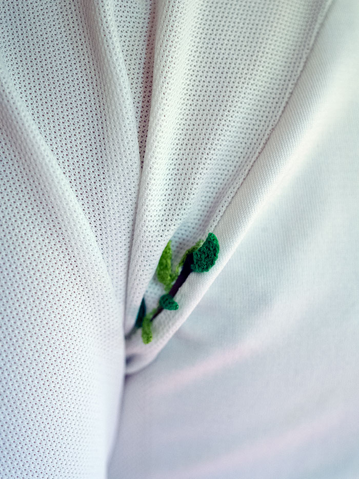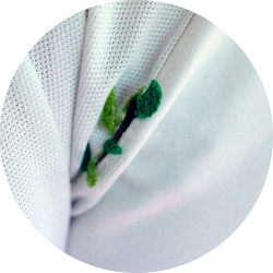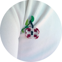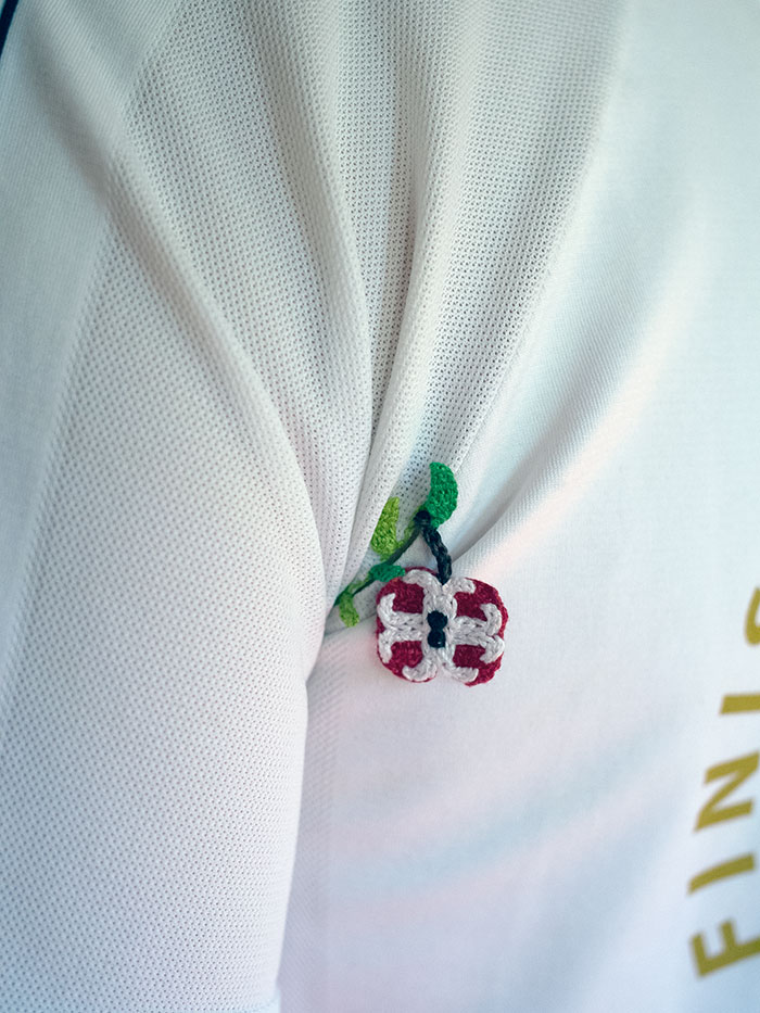 編んだリンゴの中にカルストゥラの紋章を刺繍する。