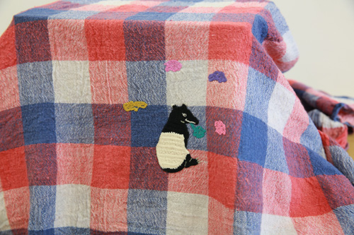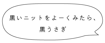黒くてふさふさしたうさぎのお母さんのワッペン、 横尾さんの作品のもさもさ感を 黒いニットに、紛れ込ませるように よーくみたらうさぎ親子が |